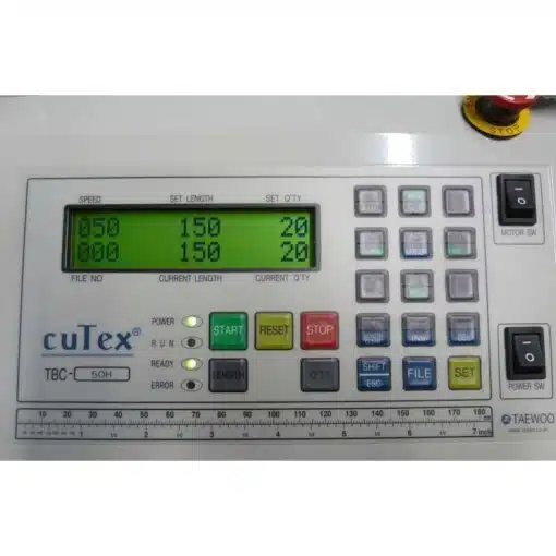 - Machine équipée d’un panel pour le réglage des longueurs, quantités et vitesse. Elle s’arrête automatiquement en cas de fin de matière. Les paramètres de coupe (longueur, vitesse et quantité) sont mémorisés même si la machine est éteinte puis rallumée.