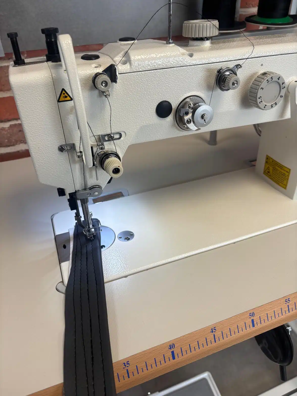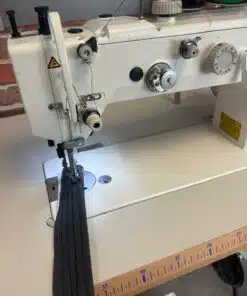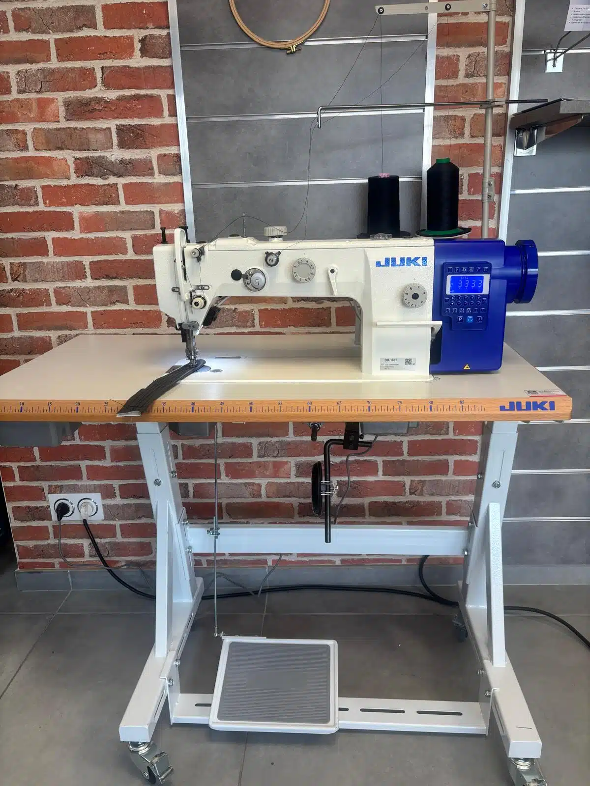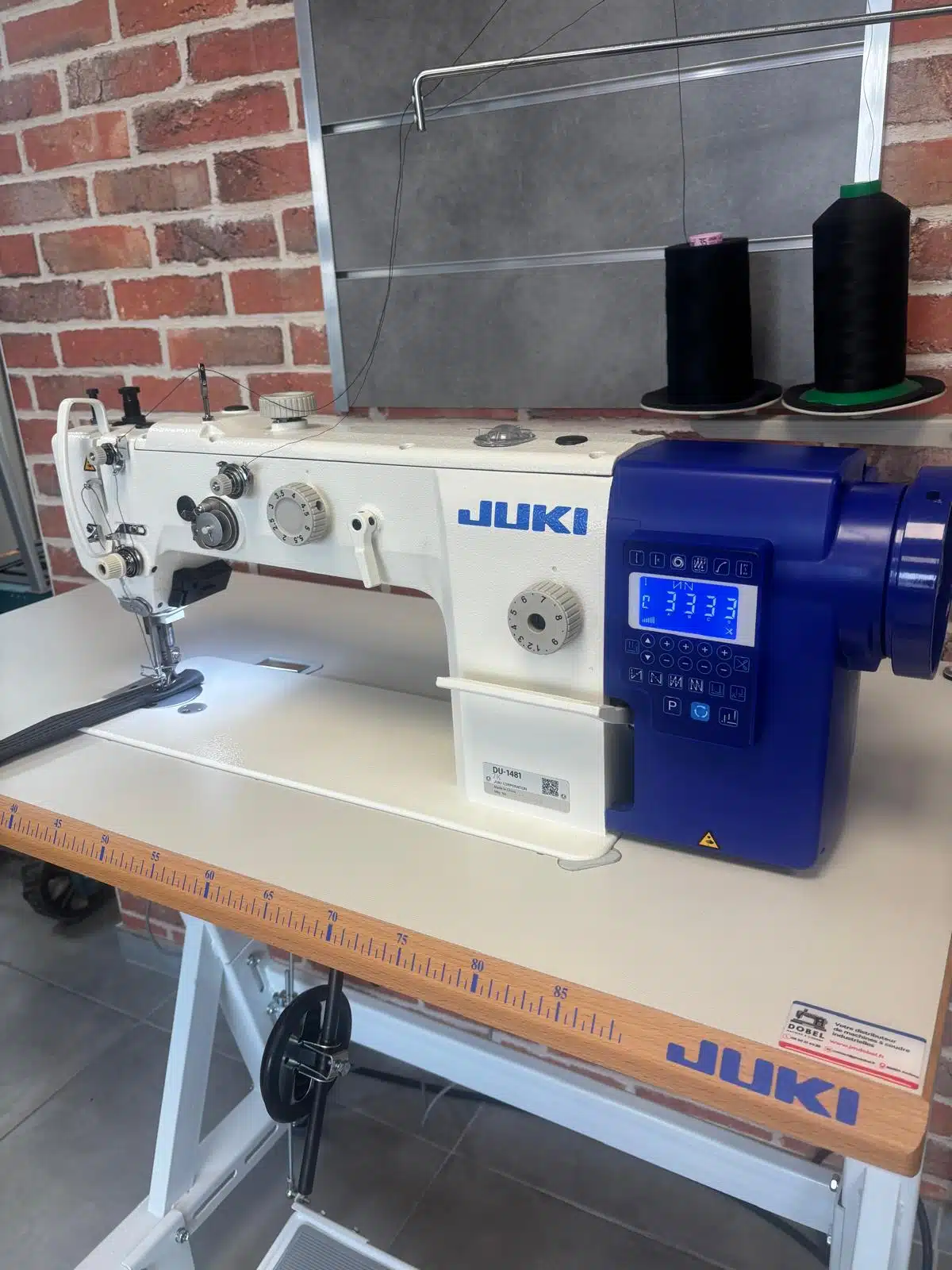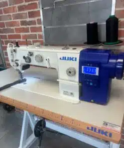 Juki DU-1481-7 piqueuse double entrainement par pieds alternatifs, une aiguille idéale pour tissus d’ameublement sur des moyen et épais, moteur positionneur intégré Direct Drive à la tête de la machine en 220V monophasé.
