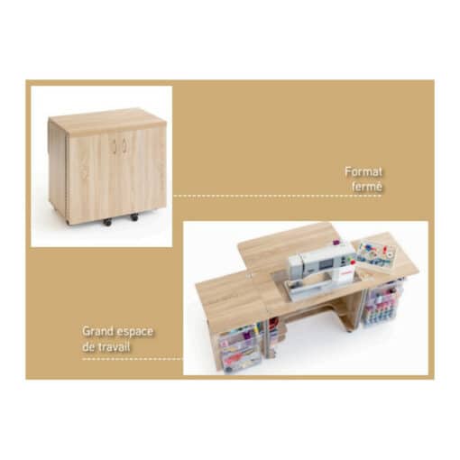 Grâce à de nombreuses solutions de rangement, aménagez votre espace de couture rapidement avec le meuble. Votre machine à coudre repose sur un ascenseur pneumatique de qualité en 3 étapes (couture, à plat et libre), le meuble permet de tout avoir sous la main.